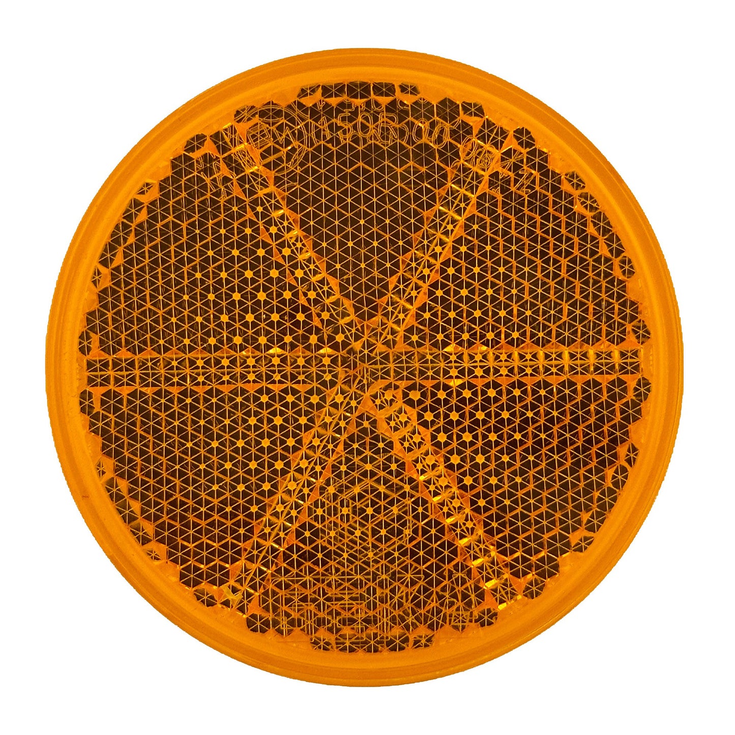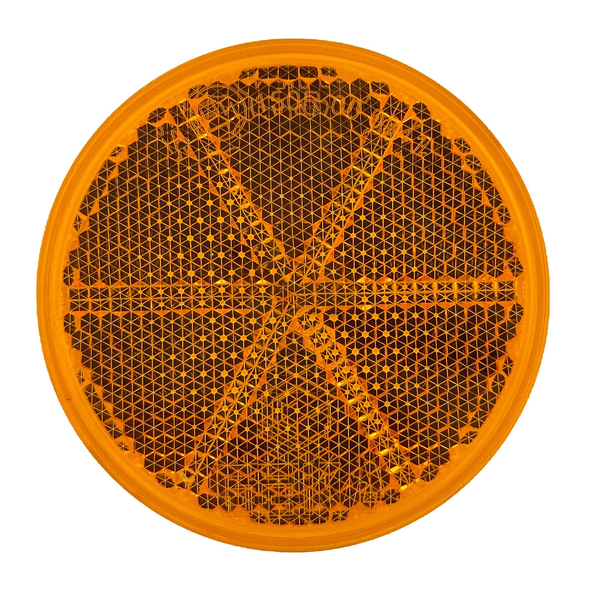 Gelber, runder Rückstrahler in Kunststofffassung mit Selbstklebefolie.