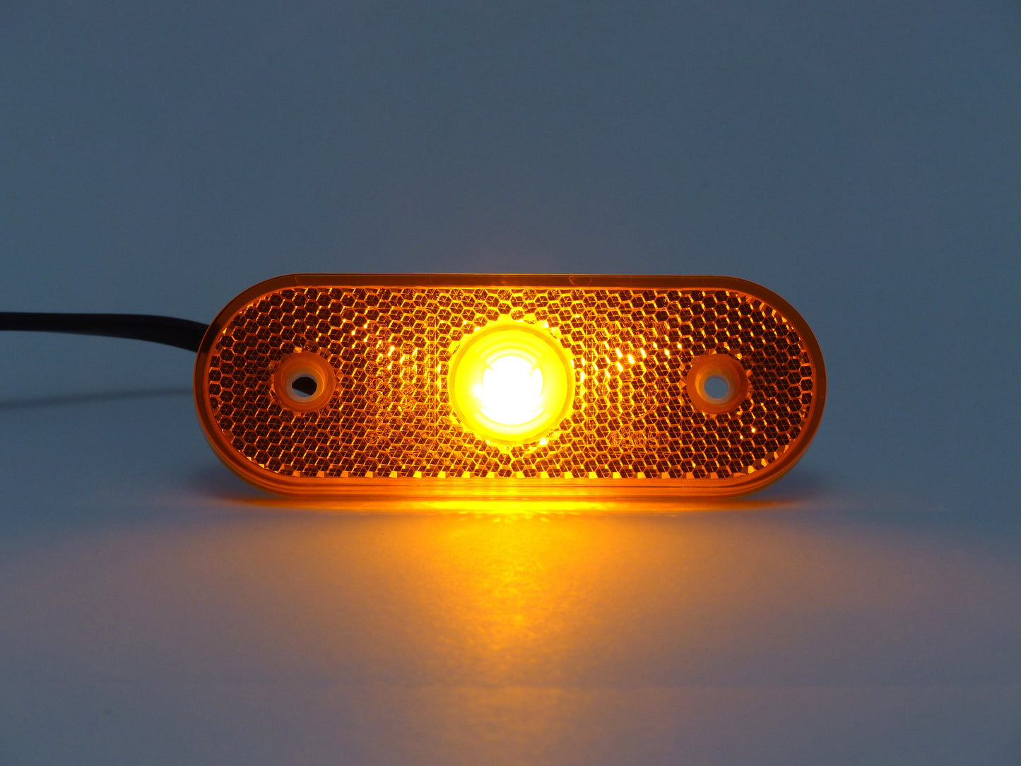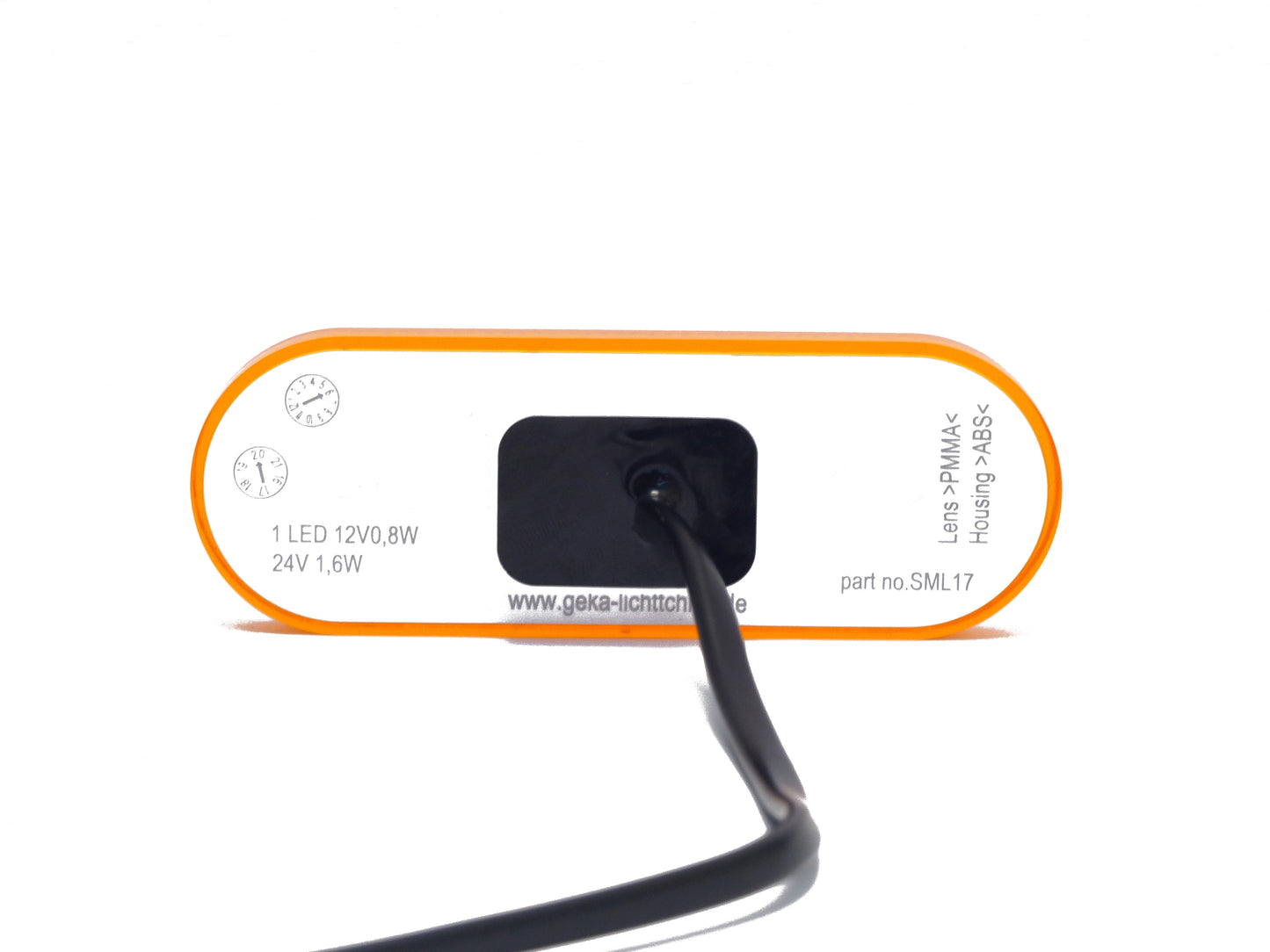 Mit einer möglichen Spannung von 9-30 Volt erreicht sie eine Leistung von 0,8 Watt bei 12 Volt und 1,6 Watt bei 24 Volt. Die Abmessungen von 107mm Breite und 36mm Höhe sorgen zudem für eine ausreichend große Reflektionsfläche. Das Anschlusskabel ist zweiadrig.