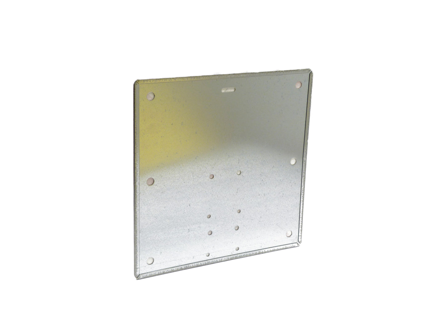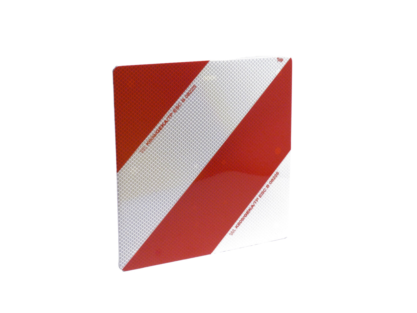 Warning reflective panel with type 3 foil 283mm x 283mm. Support plate 1mm galvanized sheet, all sides flanged. Foil on both sides, pointing left.