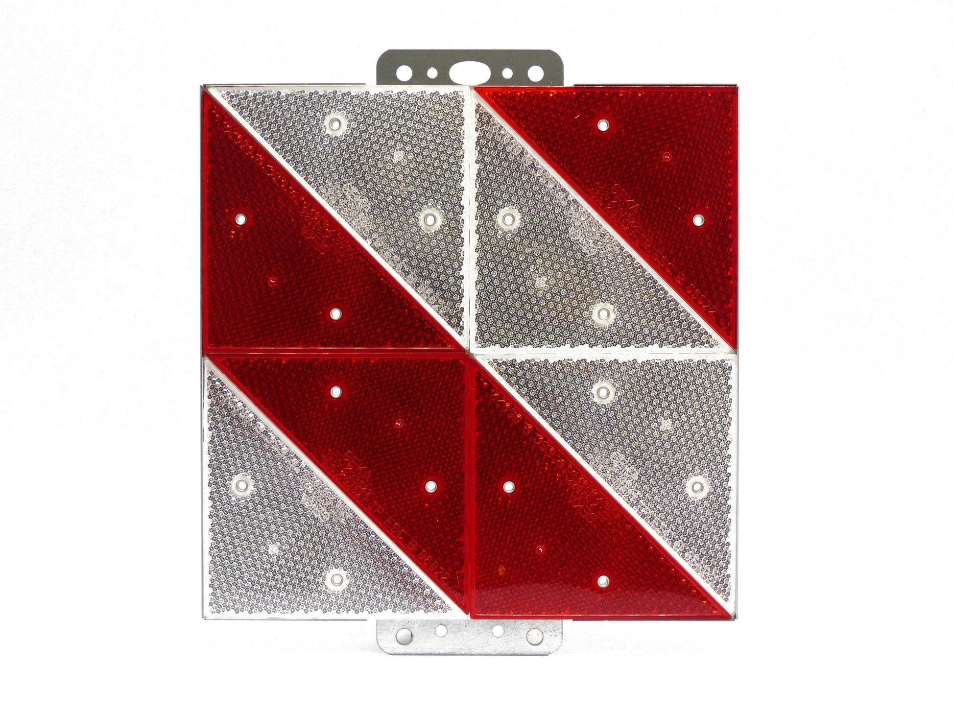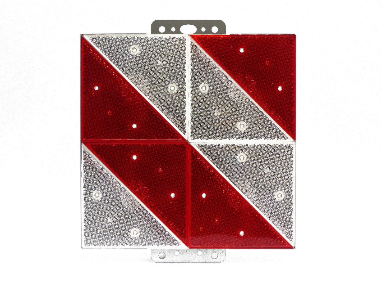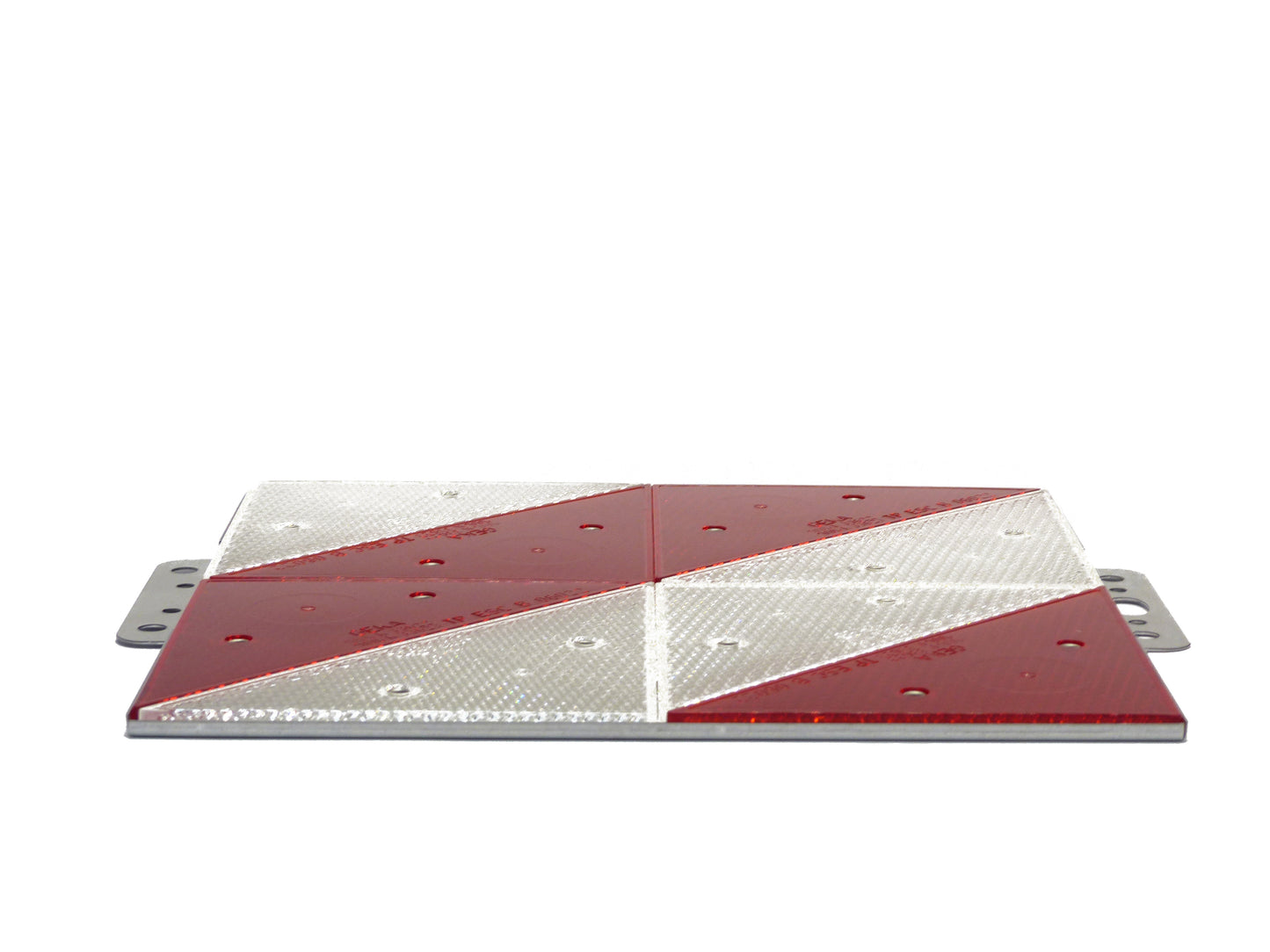 8 catadioptres rivetés sur une plaque de support de 1mm en tôle galvanisée, assurent une forte réflexion, résistants aux installations de lavage et aux nettoyeurs haute pression. Déflecteur à droite.