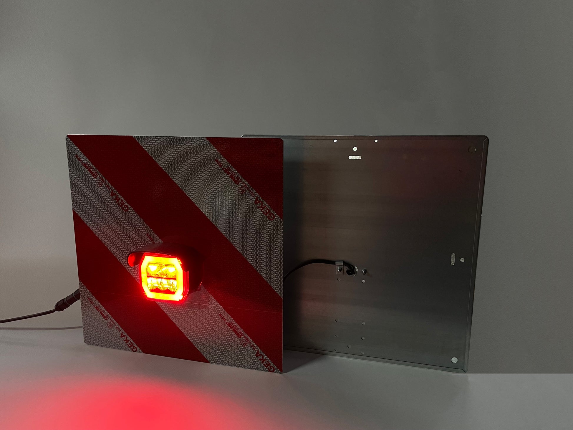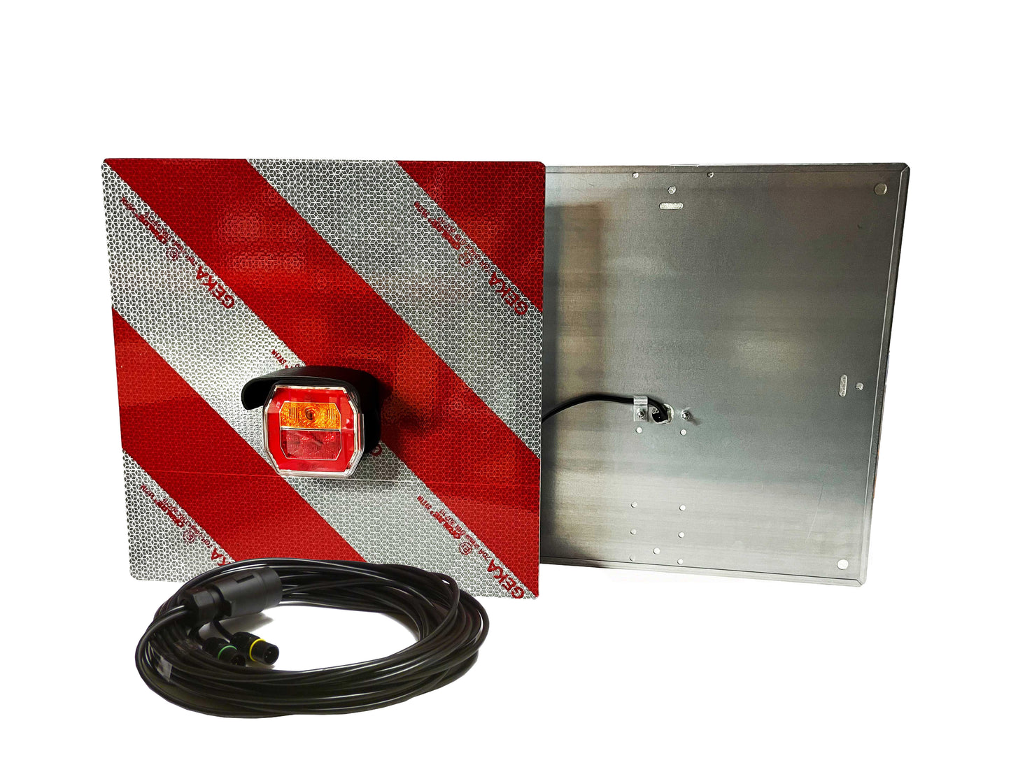 Kit de panneaux de signalisation avec système d'éclairage pour montage fixe, d'un seul côté. Chacun des deux panneaux de signalisation est équipé d'un feu arrière multifonctionnel LED BBS17LEDA.
