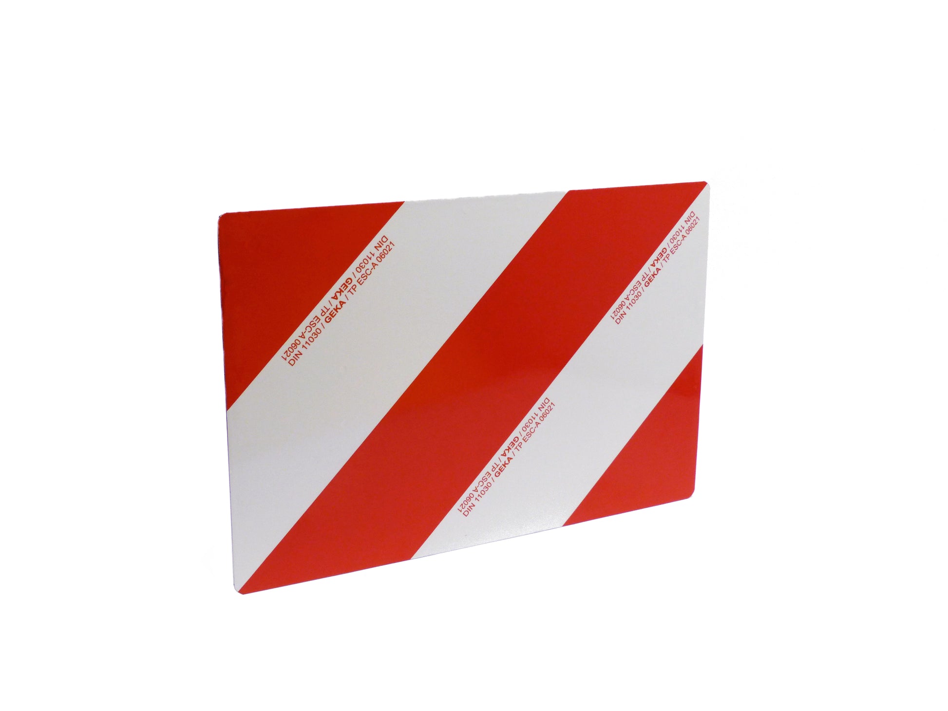 Panneau d'avertissement selon la norme DIN 11030 avec film type 1 423mm x 282mm, déflecteur à gauche. Plaque de support en tôle galvanisée de 0,8mm avec perforation pour support 11027, tous les côtés bordés, film des deux côtés.