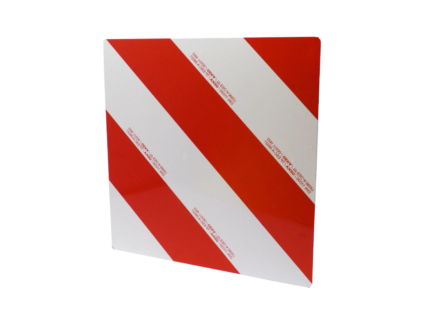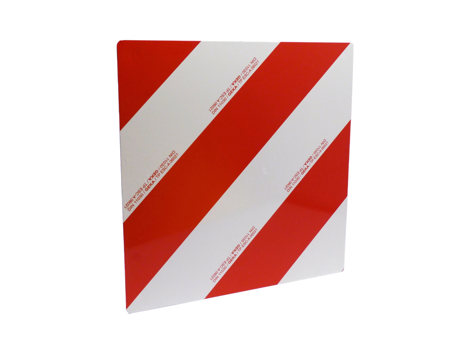 DIN 11030'a göre bir tarafı tip 1 folyo ile uyarı işareti. 423mm x 423mm boyutlarında. DIN 11027'ye göre klipsli parça için delikli, sabit montaj veya asmak için, tüm taraflar flanşlı. Destek plakası 0,8 mm galvanizli sac.